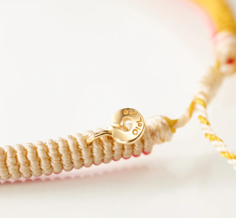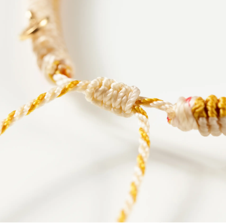 Life-armbandet i färgen Honey, designat av Charlotte Lynggaard, är flätat av nio handknutna snören, där varje snöre består av sex handfärgade nylontrådar. Avslutas med en diskret tag i 18 karat guld. Armbandet har en justerbar glidknut för perfekt passform och snörändarna är skulpterade. One size. En del av The Life Collection.