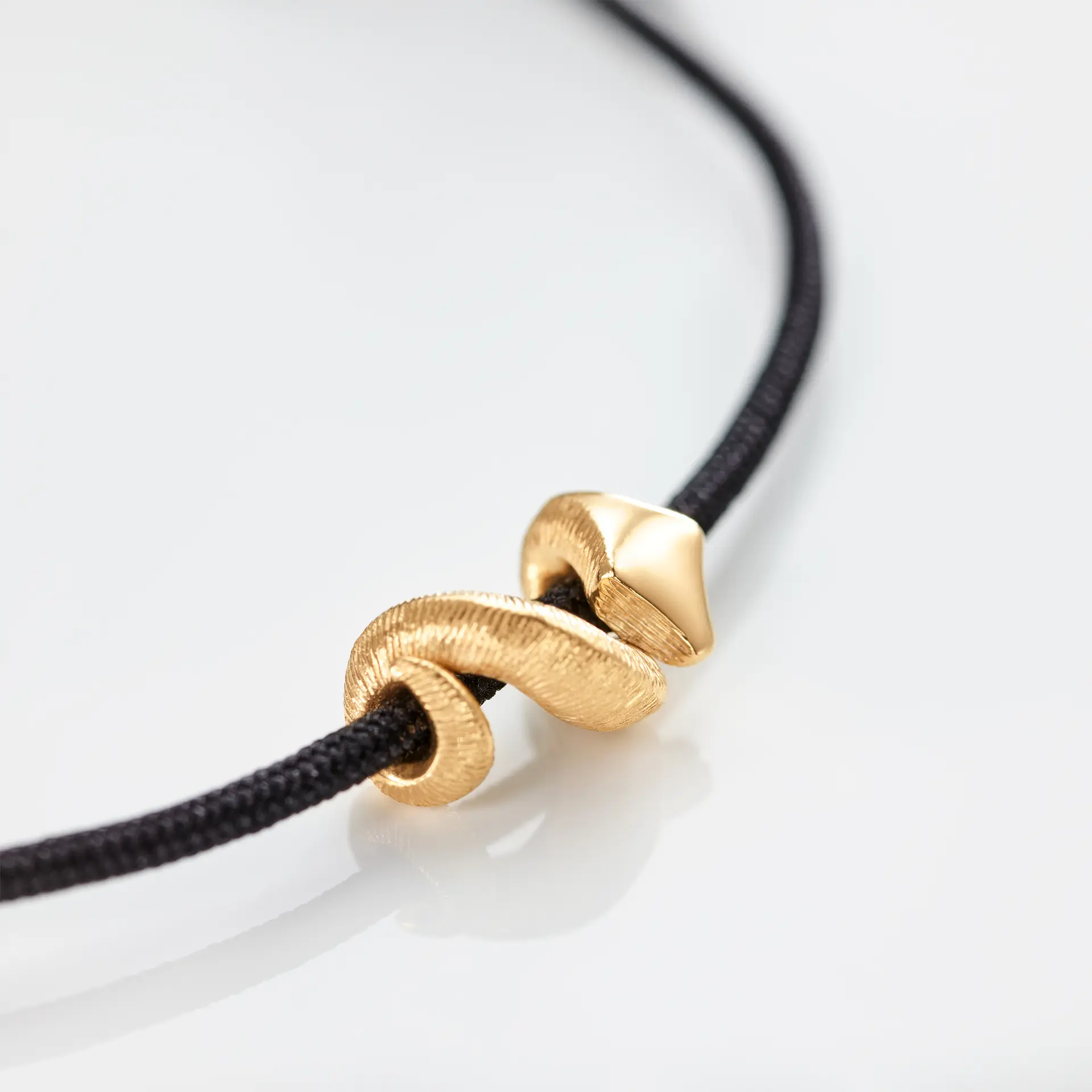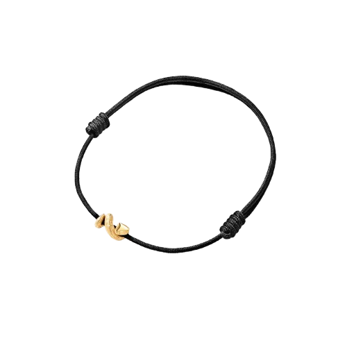 Detta Snakes-armband har en ormberlock i 18 karat gult guld, satinerad för hand för en distinkt, texturerad finish. Berlocken är elegant kombinerad med en handknuten, svart snodd, bestående av fyra trådar. Armbandet är justerbart i omkrets, vilket gör det enkelt att ta på och av. Designat av Ole och Charlotte Lynggaard. Del av The Snakes Collection. Unisex.
