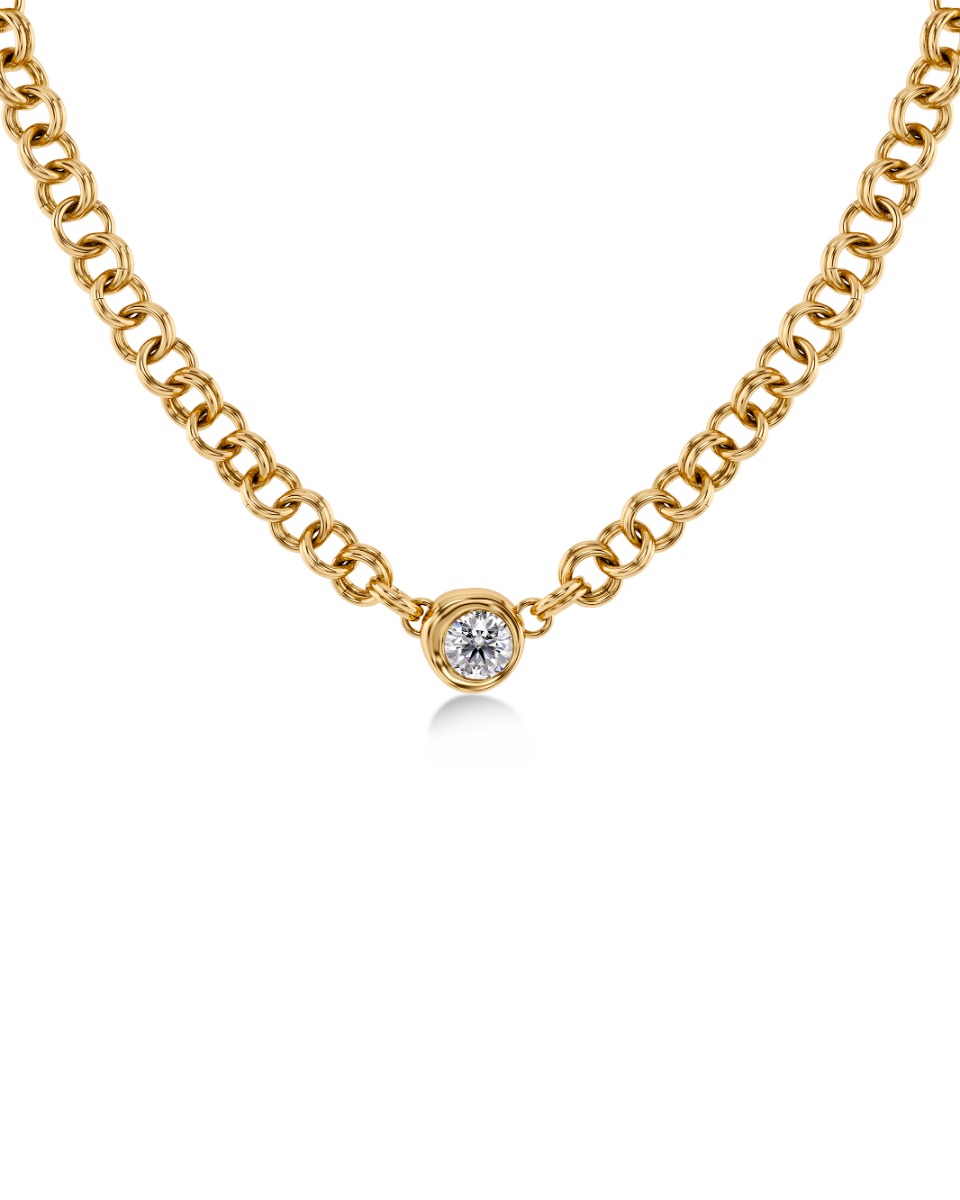 Detta coola halsband har en kraftig kedja med dubbla länkar, här i 14K guldplätering, med en stor, vacker glittrande sten mitt på. Fint att styla med någon av seriens örhängen eller ring.