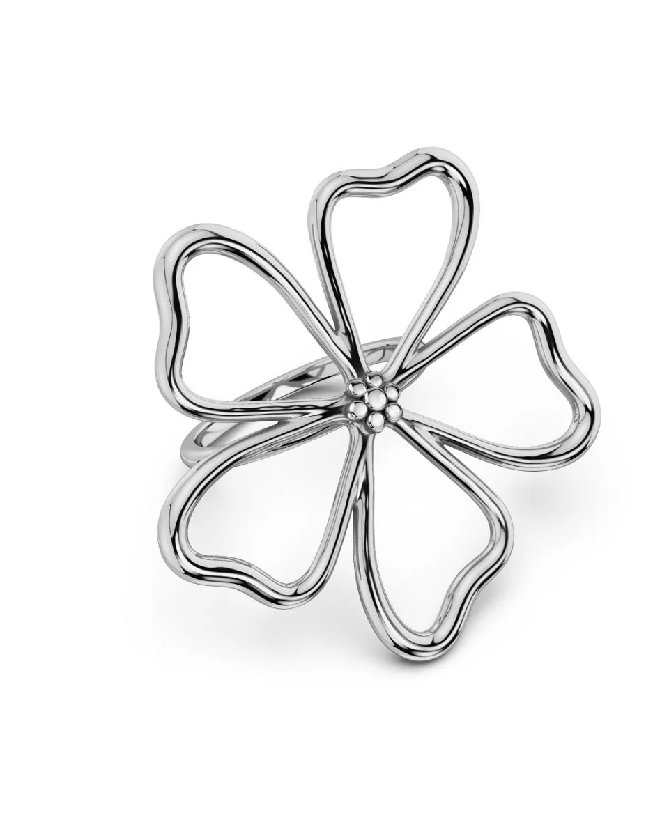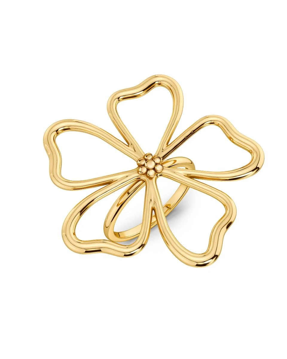 Guldpläterad stålring som har en vacker blomform fäst direkt på skenan. Fin att matcha med seriens maxade statementörhängen.