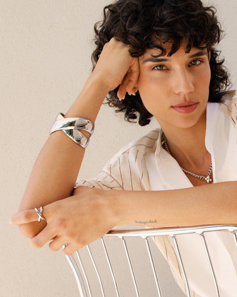Här i en maxad ring med en vacker X-form som skapar ett uttrycksfullt statement på fingret. Styla gärna tillsammans med seriens lika maxade bangle, halsband eller örhängen.