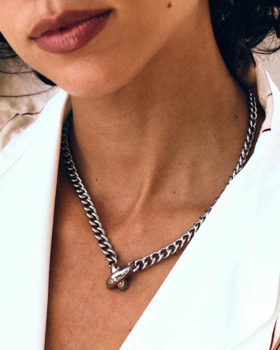 Här i ett kaxigt maxat halsband med en kraftigare kedja med den vackra X-formen fäst mitt på. Styla gärna tillsammans med någon av seriens armband, örhängen eller ringar.