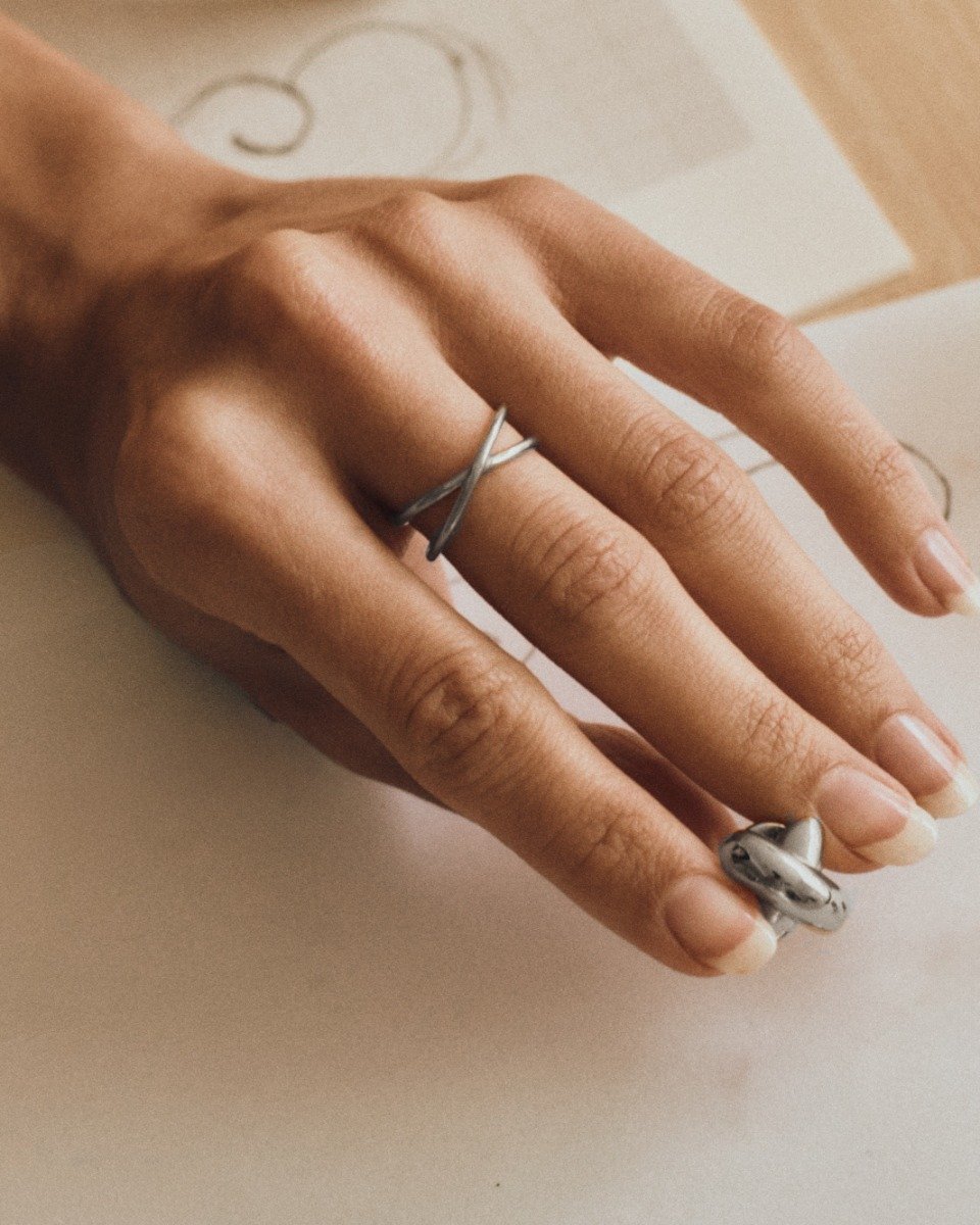 Här i en tunnare ring med en vacker X-form som sitter fint på fingret. Styla gärna tillsammans med seriens armband, halsband eller örhängen.
