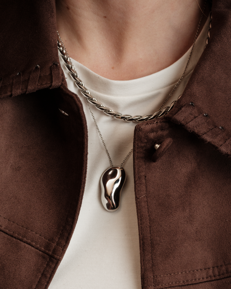 Amira, långt halsband av en nätt kedja, tillverkat av guldpläterat rostfritt stål. Halsbandet har ett hänge med en oregelbunden yta och blank finish.