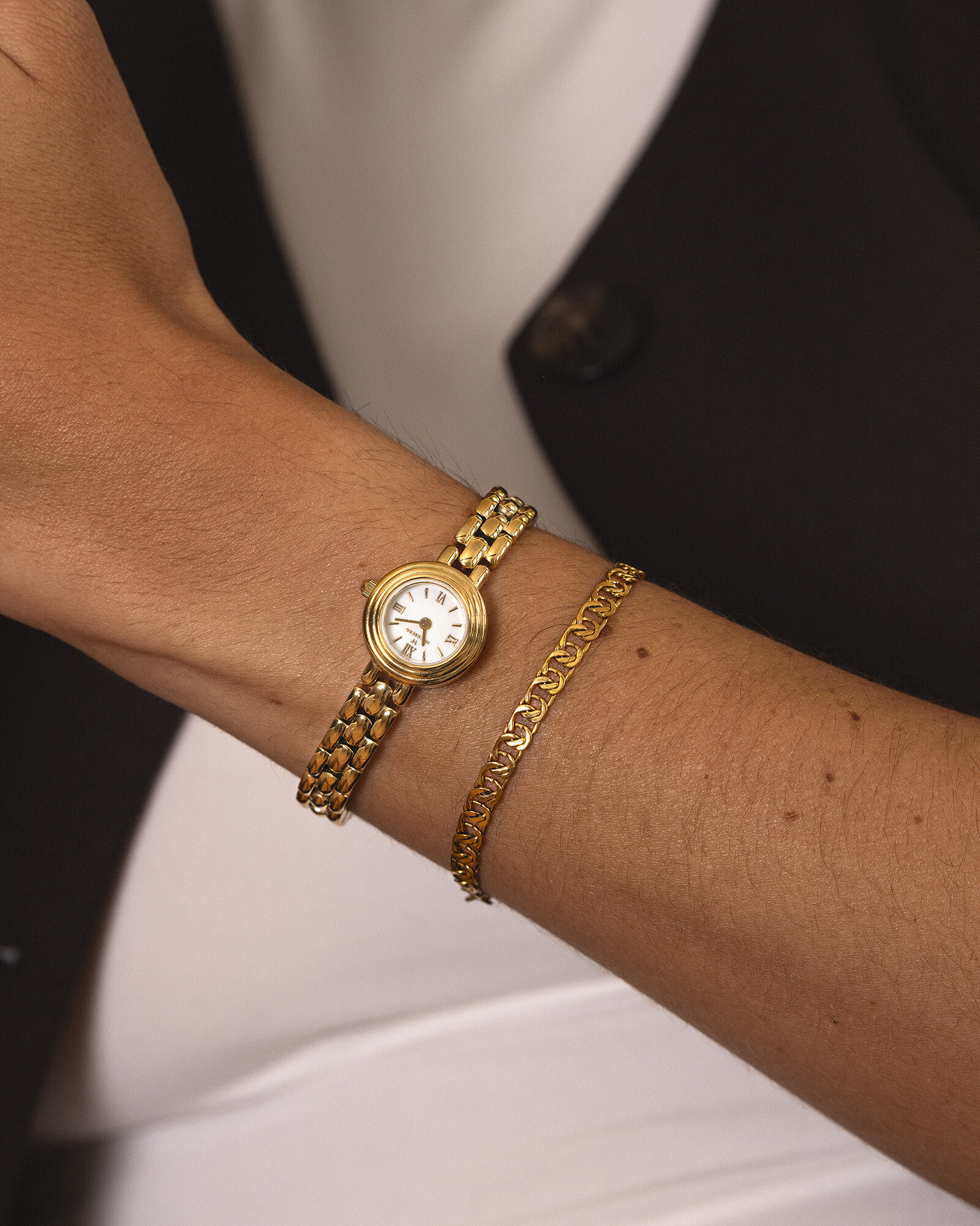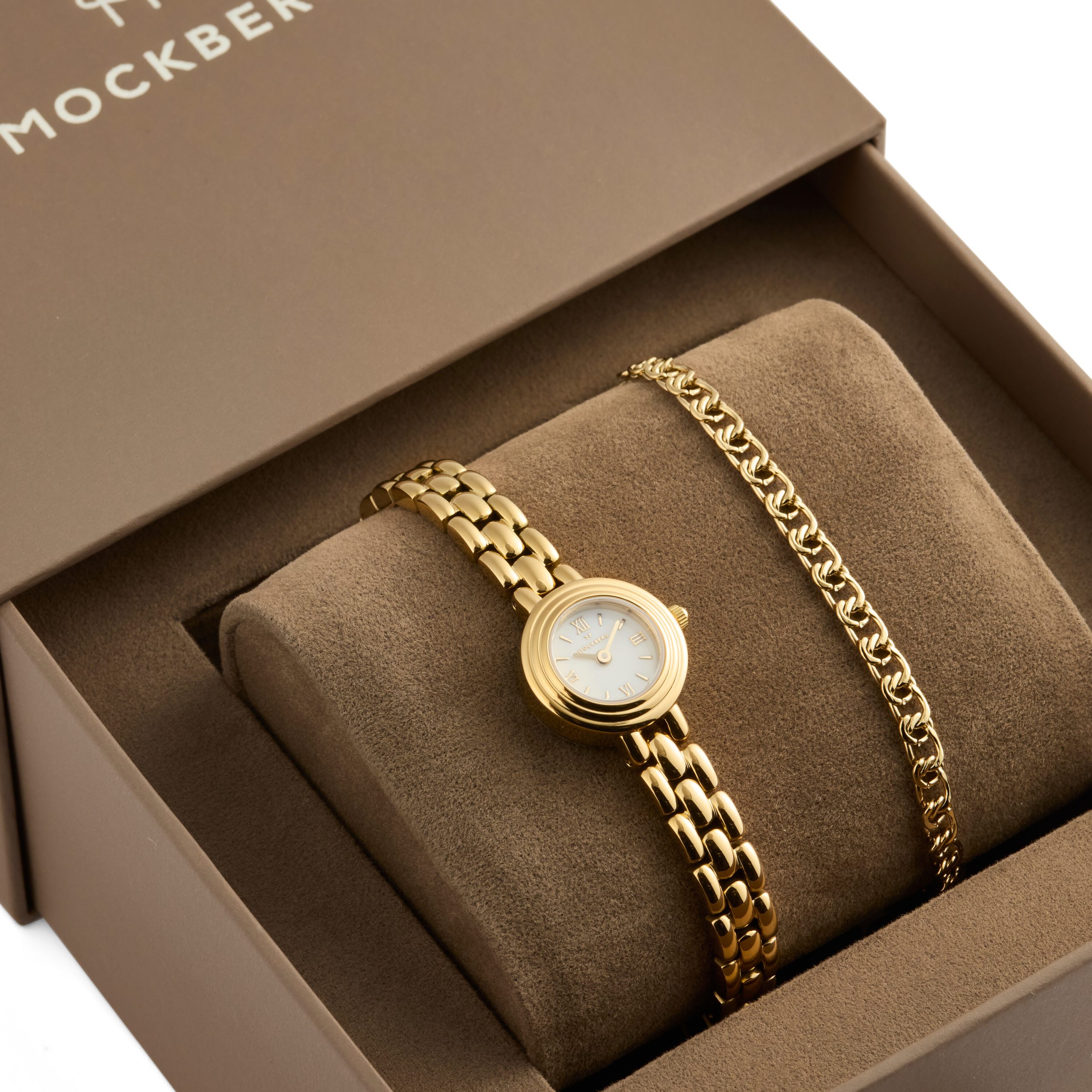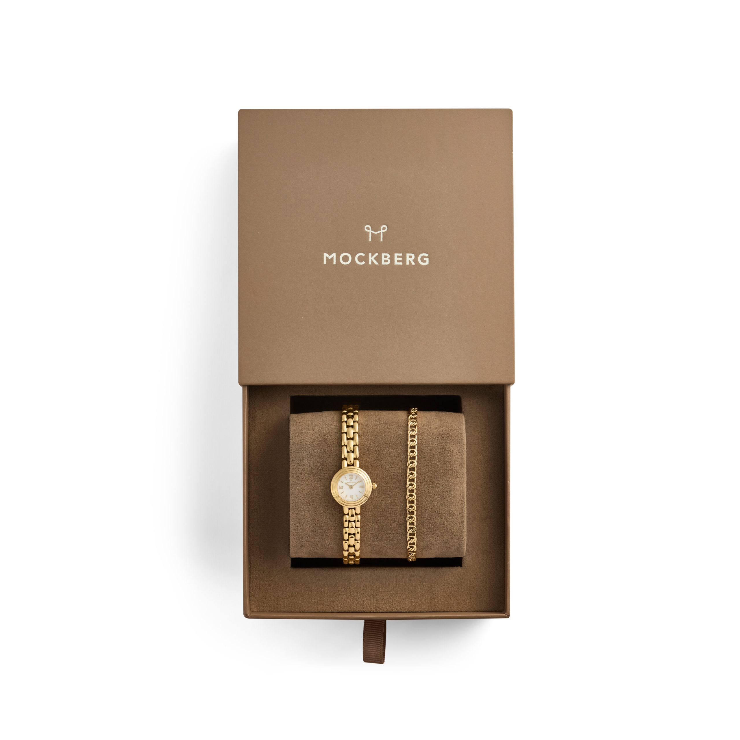 Mockbergs gåvoset med Antique-klocka och armband ger en klassisk, sammanhållen look som passar både vardag och fest. Kombinationen är lätt att bära och lyfter din stil utan att ta över. Klockan och armbandet levereras tillsammans i en lyxig presentask.