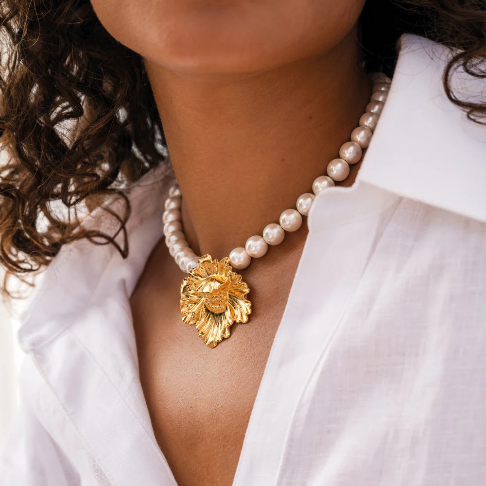 En modern twist på klassisk elegans, Bibi Pearl Choker kombinerar skimrande pärlor med ett skulpterat blomsterhänge. Det här är det perfekta halsbandet för att addera en stilmedveten touch till dina looks!