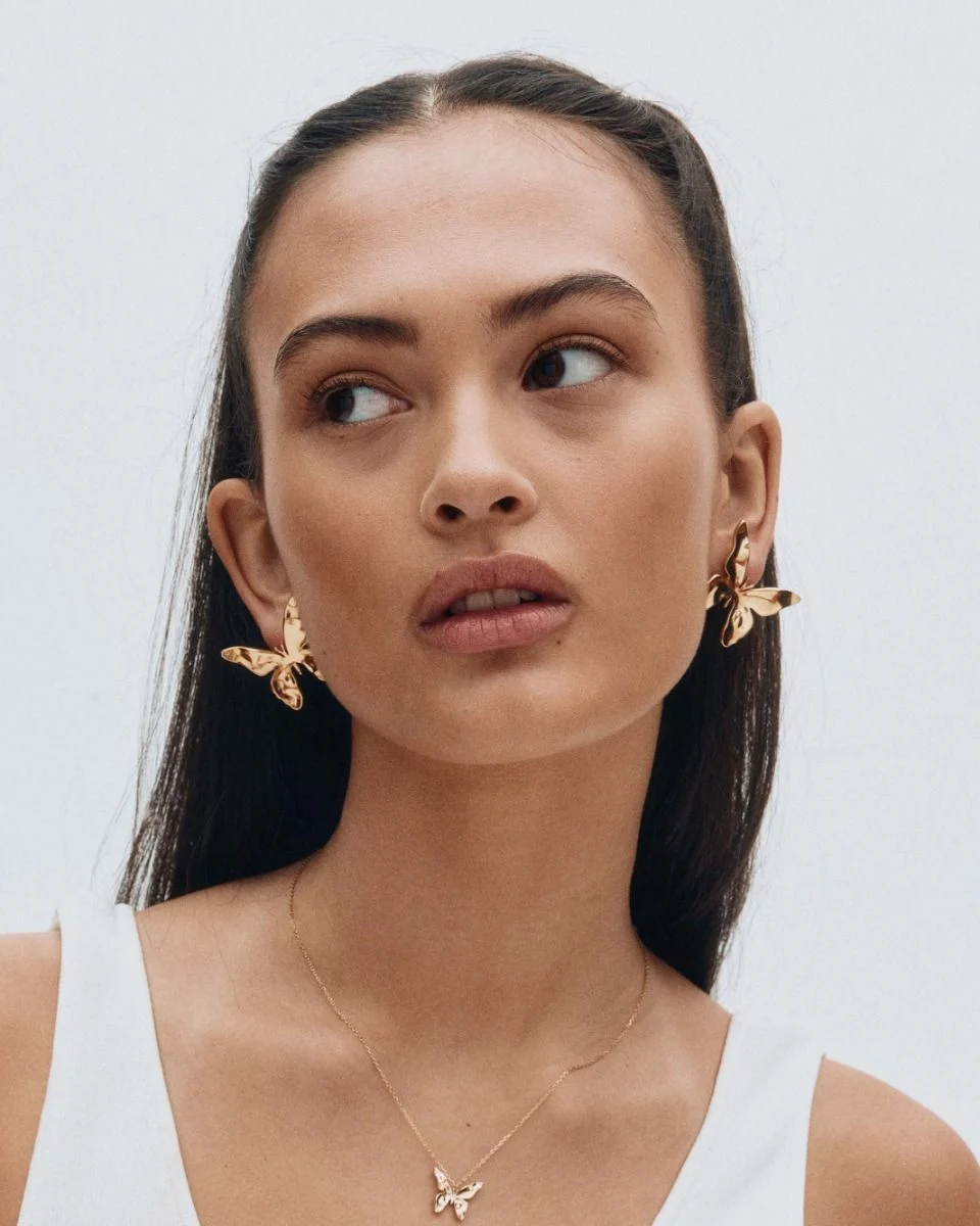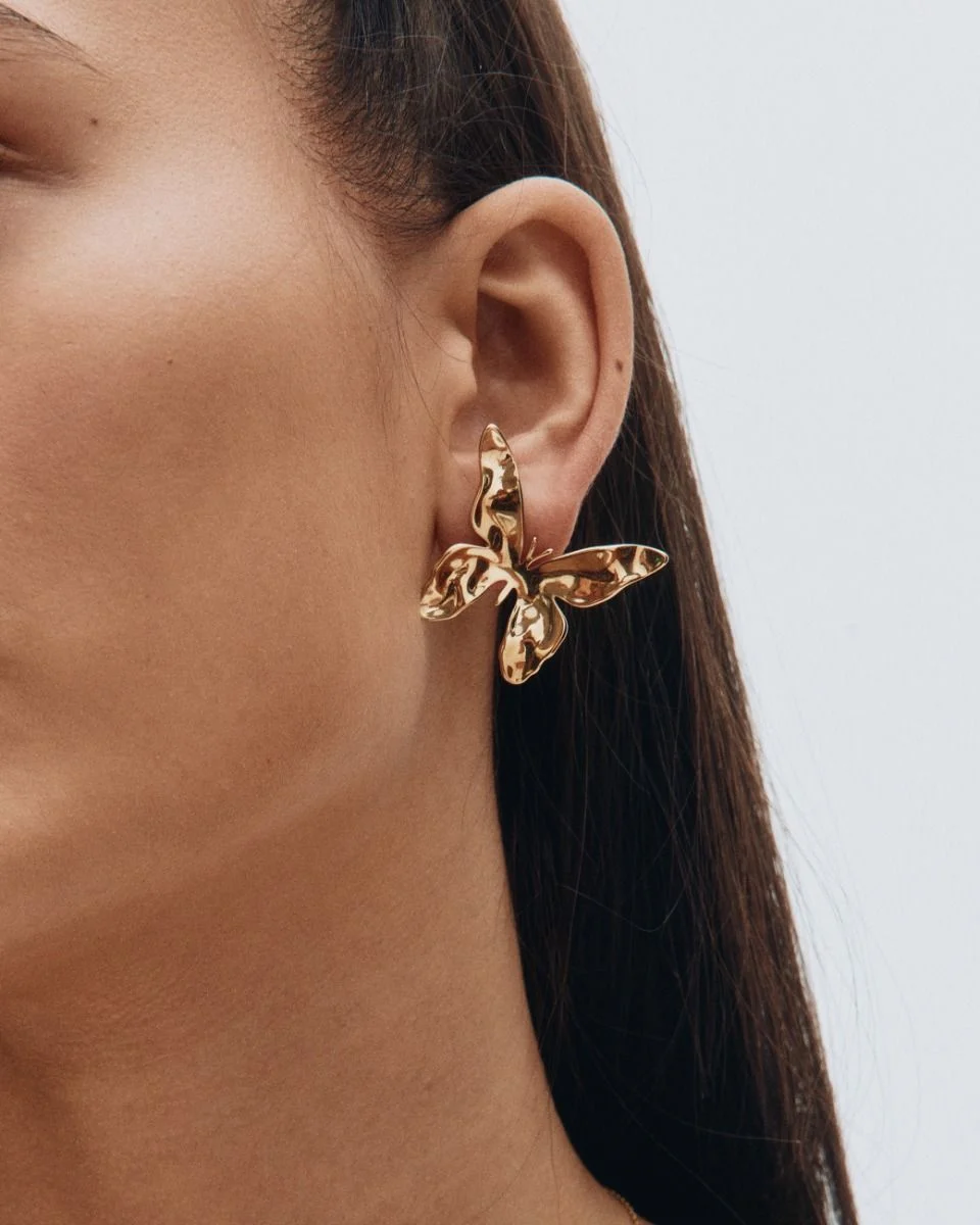 Den stiliserade fjärilen i serien Butterfly är en symbol för en ung själ, för frihet, förvandling och hopp. Här i överdimensionerade studs som sitter fint i örat med den vackra fjärilsformen i 14K guldplätering. Perfekta att matcha med seriens större ring eller halsband.