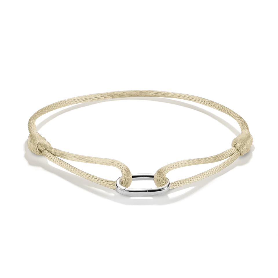Detta beigea textilarmband är ett stilrent basic som lyfter dina charms diskret men effektfullt. Connect-länken i återvunnet 925 sterlingsilver ger en tydlig fokuspunkt och gör det enkelt att byta eller kombinera charms.