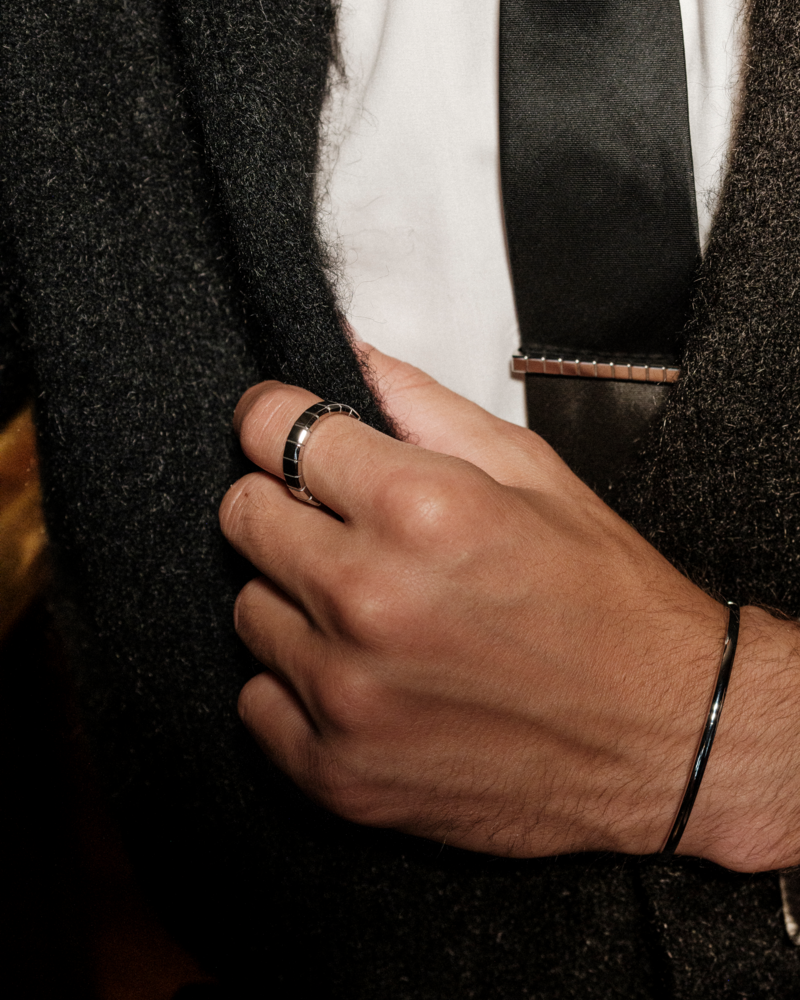 Ringen har en kub-liknande design och kan enkelt matchas med tillhörande manschetter och slipsnål för en komplett look
