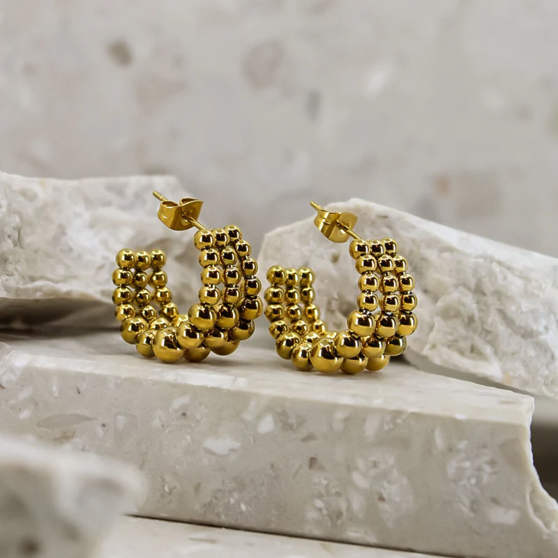 Upptäck SINTRIDOUs stiftörhängen i kirurgiskt stål, med val av rostfri finish eller 18 karats guldplätering. Designade med tre rader bubbliga halvcirklar för en dynamisk, iögonfallande look. Perfekta för både fest och vardag – kombinera med en vit skjorta, jeans och boots för en stil som känns både uppklädd och edgy. Dessa örhängen blir garanterat en favorit som lyfter din look vid varje tillfälle!
