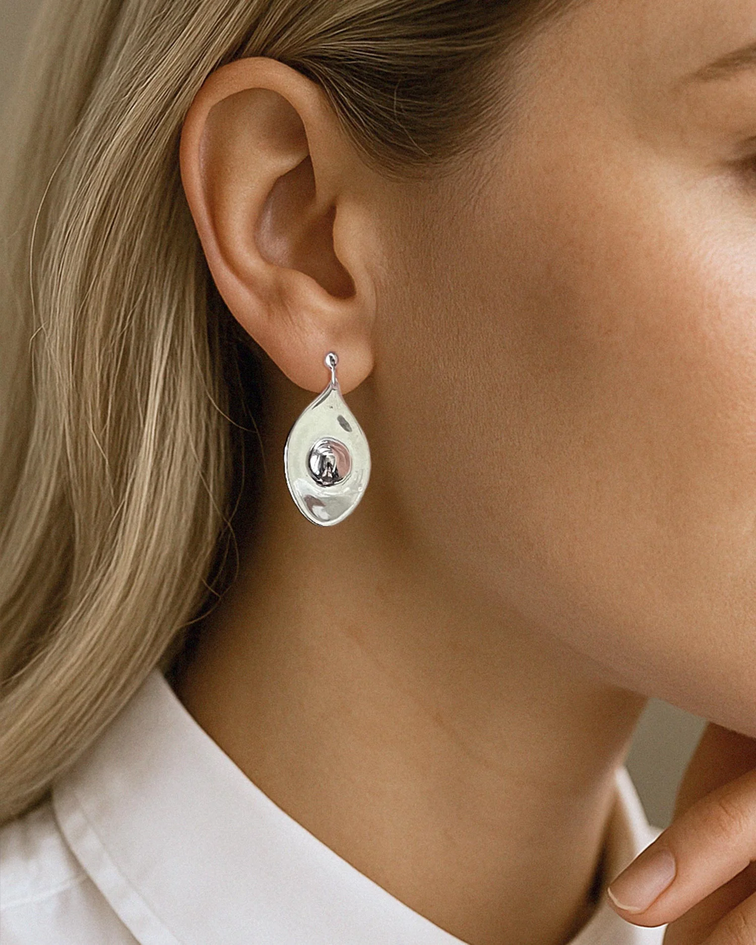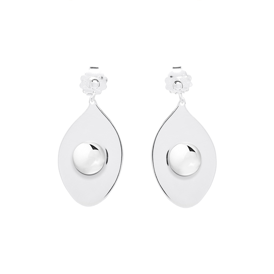 Ett par stora, hängande silverörhängen med polerad finish. Örhängena har en elegant droppform och en rund upphöjd detalj i mitten av hänget.