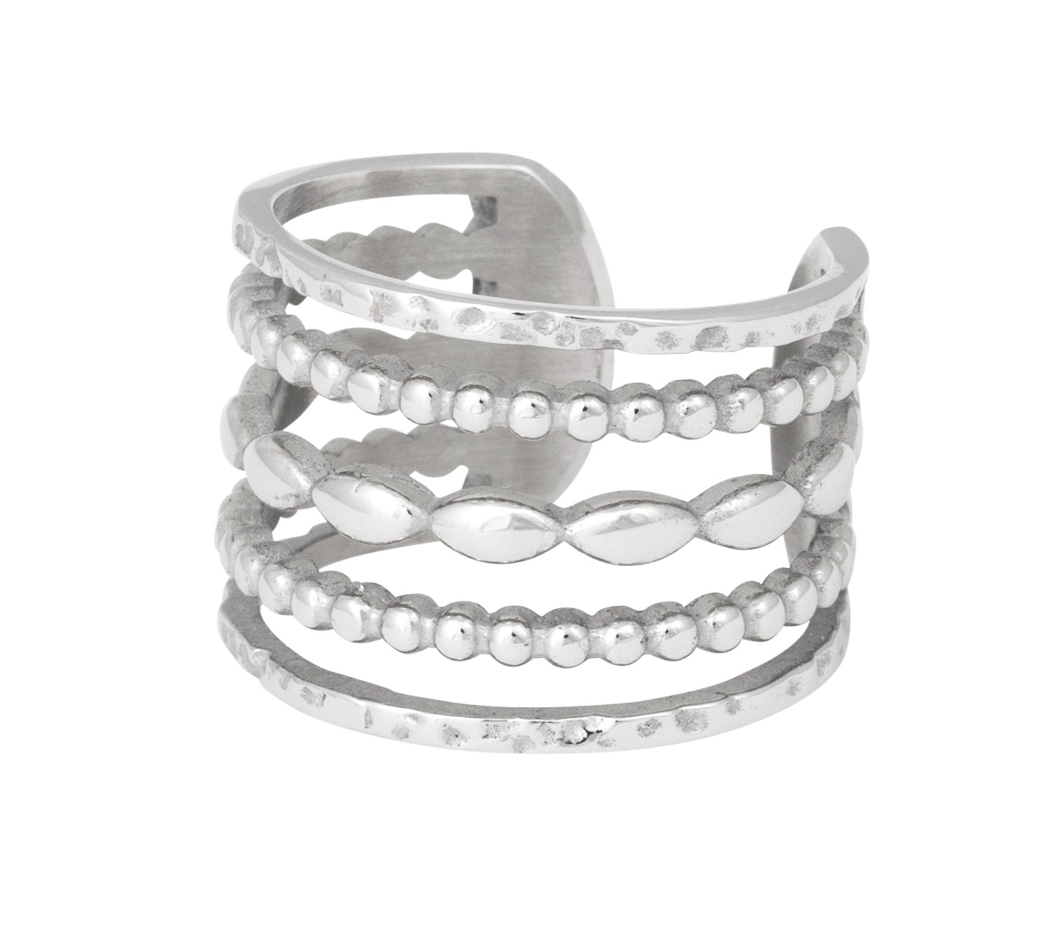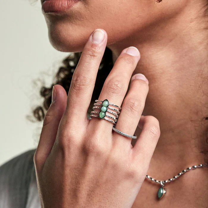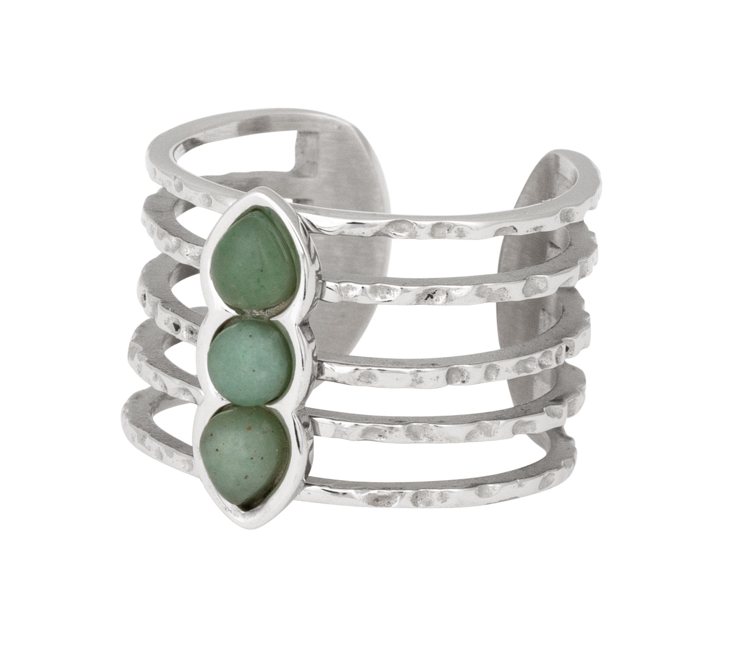 Ring i rostfritt stål designad med flera smala hamrade band och tre gröna aventurinstenar.