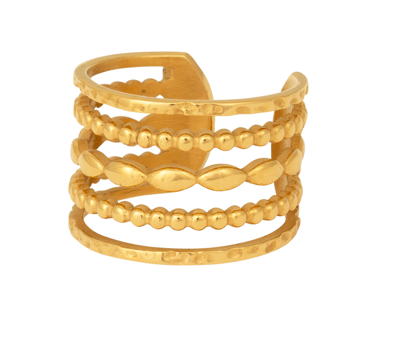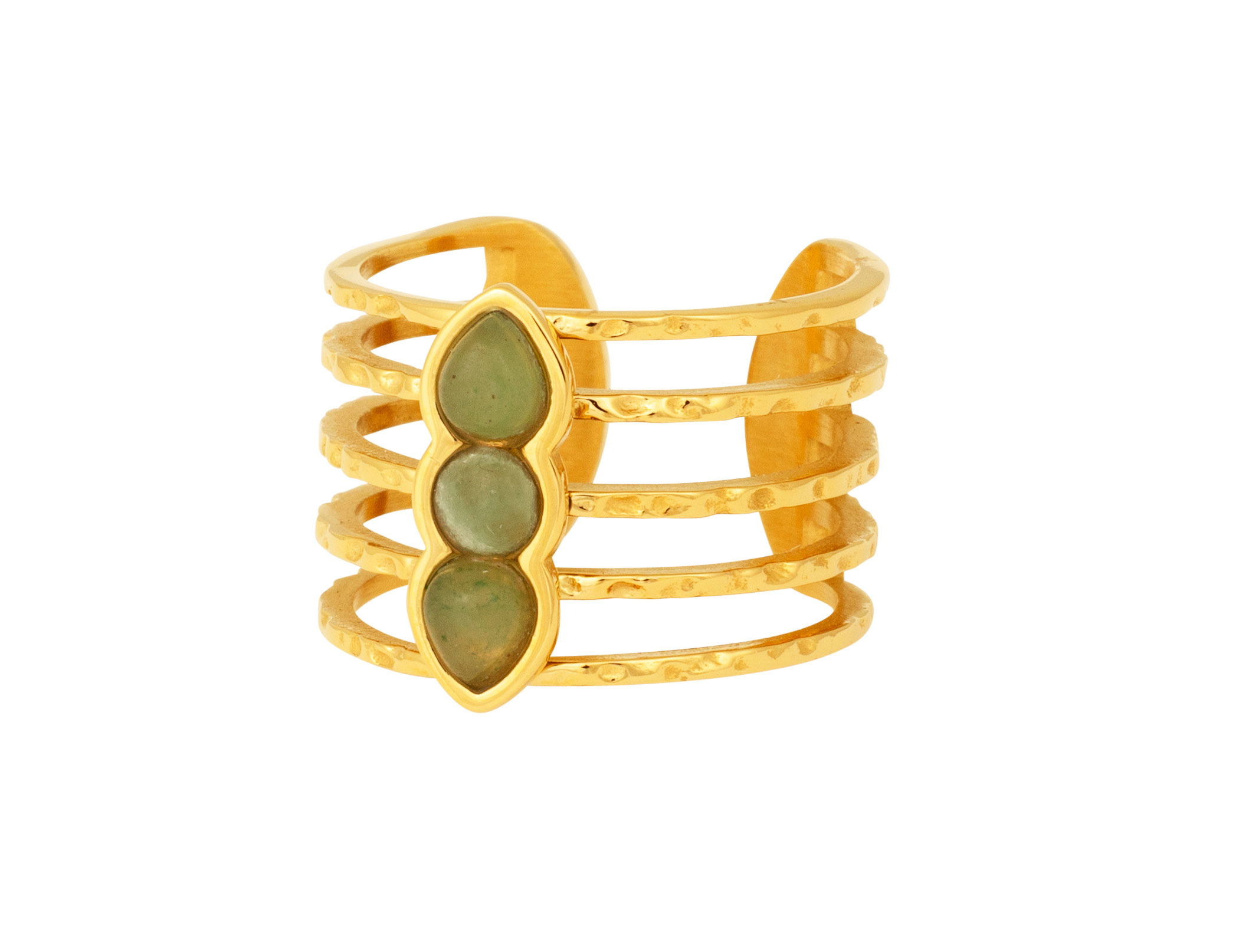 Ring i rostfritt stål med 18K guld PVD-plätering. Designad med flera smala hamrade band och tre gröna aventurinstenar.