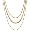 3-radigt, långt halsband av 2 st platta herringbone kedjor samt en rund ormkedja i guldpläterat stål med blank finish.