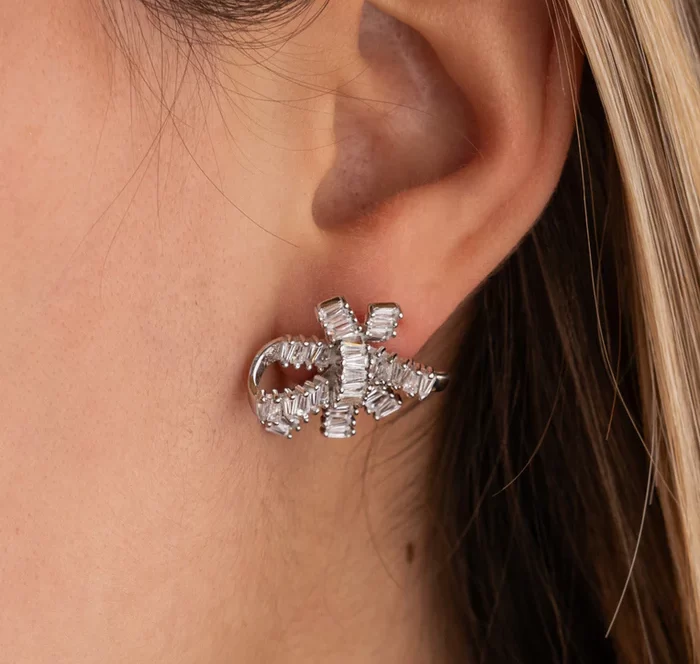 Små örhängen i 925 sterling silver med rektangulära zirkoner i en blommig design. De gnistrande stenarna ger en subtil elegans – perfekta för en feminin och sofistikerad look.
