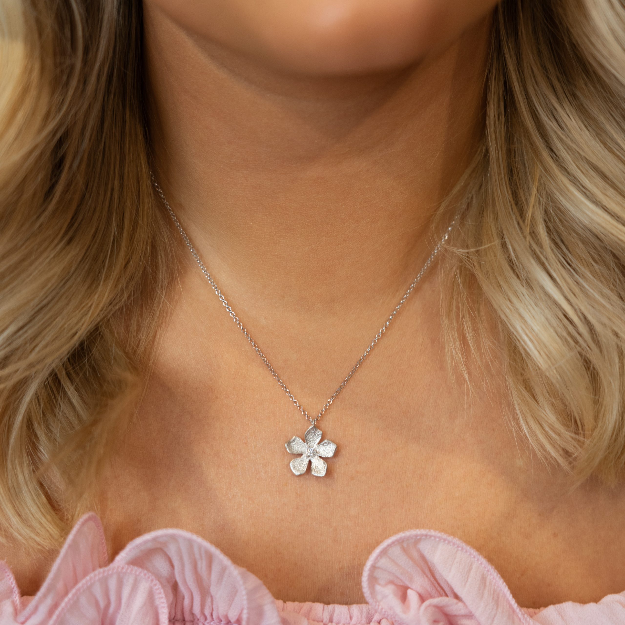 Vackert halsband i 925 rhodinerat silver föreställande en vacker blomma med en gnistrande cz-sten.
