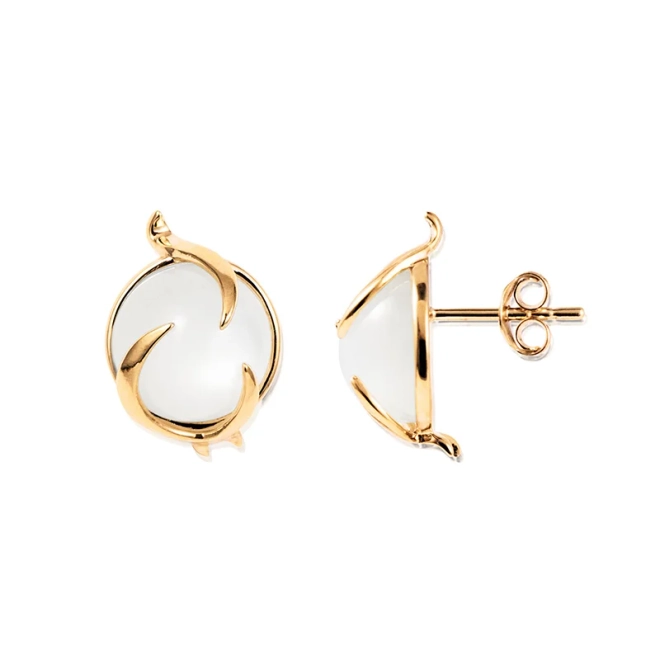 18k guldpläterade silverörhängen med en månsten, omgiven av former som liknar ett spirande skott. Smycket står för hopp, förändring och nya början – vackert både till vardag och vid stunder du vill bära nära hjärtat.