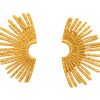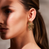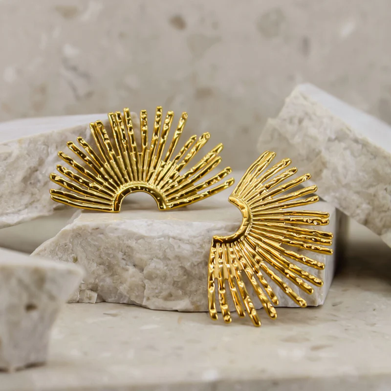 Upptäck SINTRIDOUs extravaganta solfjäderformade örhängen som utstrålar elegans och självförtroende. Perfekta för att verkligen stå i blickfånget, dessa örhängen tar dig med till Greklands varma sol och svalkande havsbrisar – en hyllning till kvinnan och moder jord. Tillverkade i rostfritt kirurgiskt stål, här i en lyxig 18 karats guldplätering.