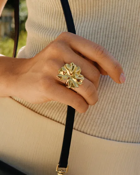 Gerana stora böljande blomblad spelar huvudrollen i seriens maxade stålring, här i 14K guldplätering, vecklar den stiliserade blombladsformen ut sig vackert över handen.
