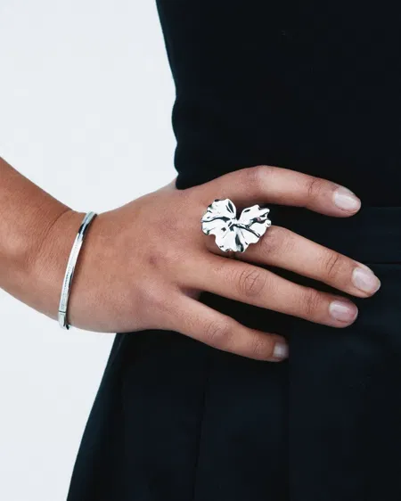 Gerana stora böljande blomblad spelar huvudrollen i seriens maxade stålring, vecklar den stiliserade blombladsformen ut sig vackert över handen.