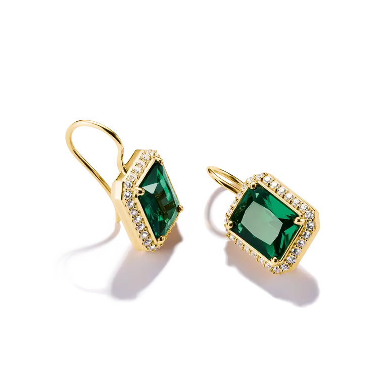Grafisk klarhet, levande färg: exakt slipade åttkantiga stenar i rik grön färg sitter i centrum av dessa örhängen. En filigranram av gnistrande vita zirkoner ger designen lätthet och djup, medan brisurspännena säkerställer ett pålitligt grepp. En modern tolkning av bohemisk elegans för en stark, feminin look.