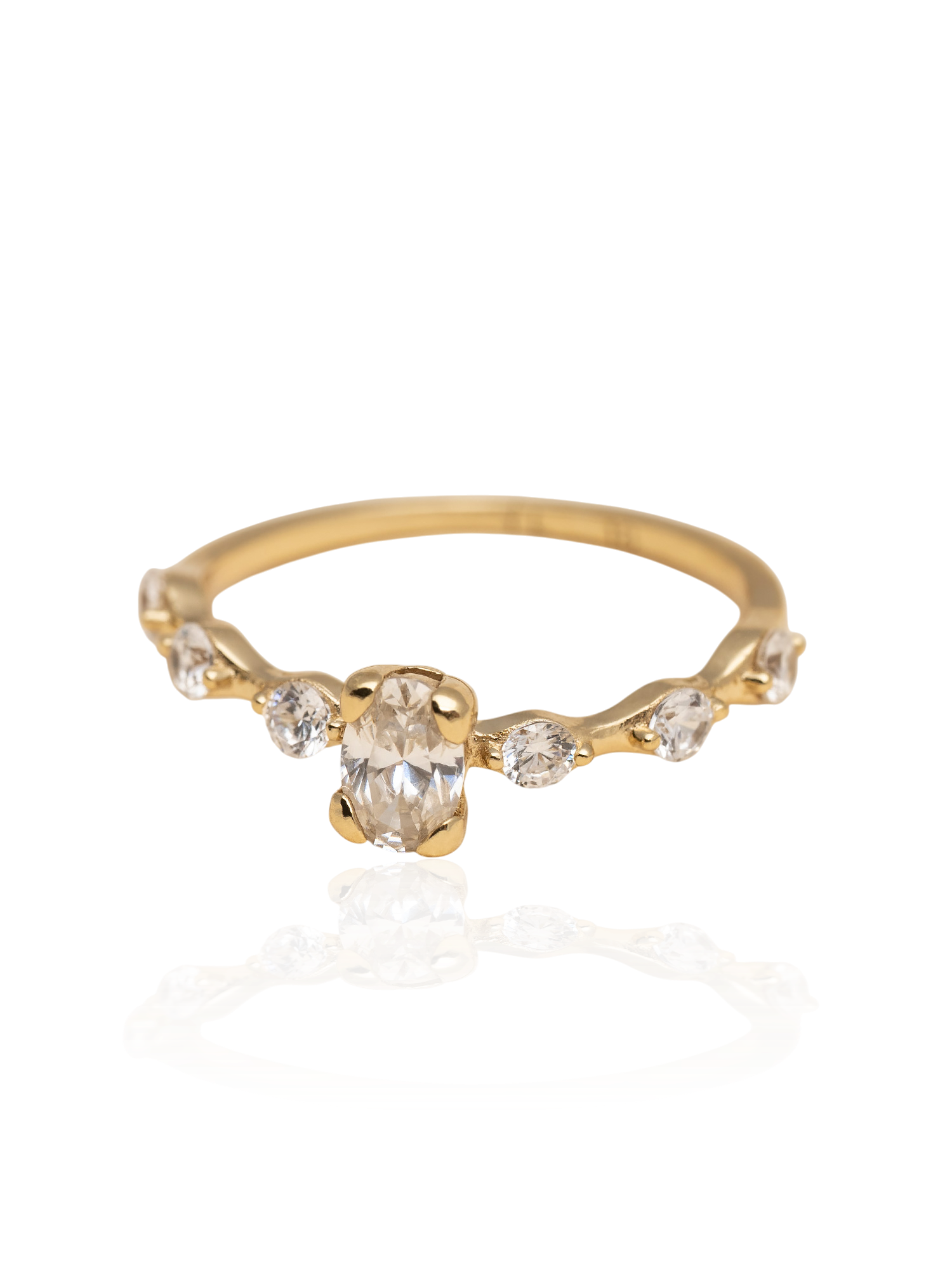 Där modern design möter klassisk lockelse. Idunn-ringen har en lysande mittsten, inramad av fina mindre stenar som förstärker dess glöd.