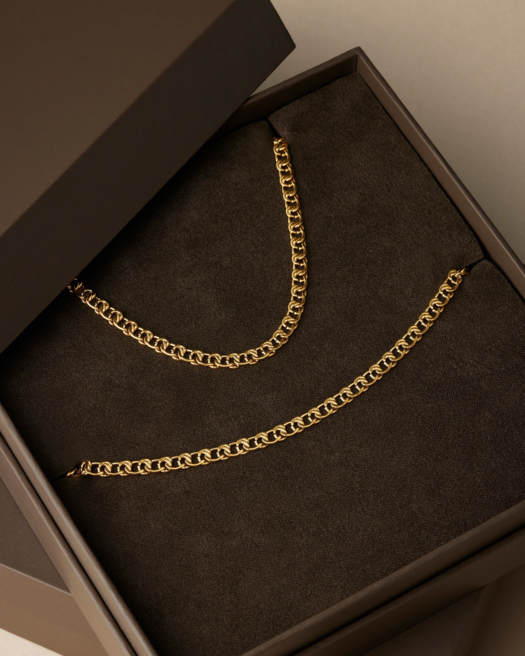 Glans i två delar – ett set som ramar in handleden och halsen med samma rena curb chain-uttryck. Bär dem tillsammans för ett tydligt, harmoniskt intryck eller var för sig när du vill hålla det stilla. Slitstarkt, vattentåligt och lätt att styla – ett säkert val från vardag till kväll. 18K guld PVD-beläggning.
