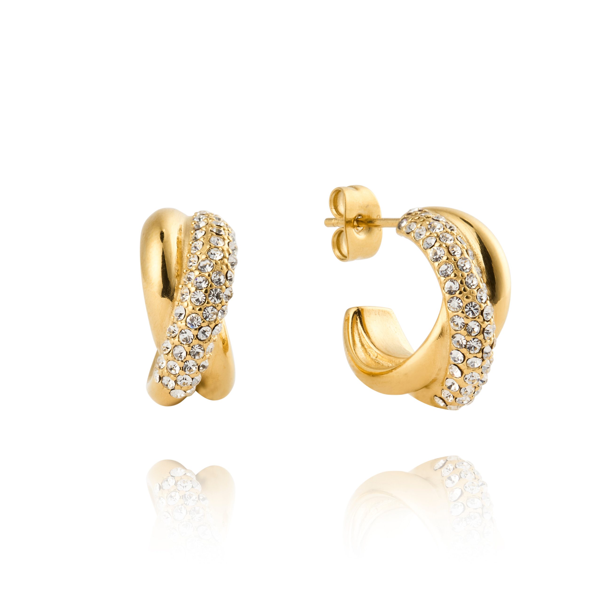 Varm glans i nätt format. Aurora Gold Hoops kombinerar klassisk creol med vita Preciosa-stenar för ett tydligt men mjukt uttryck – lika fint solo som i par med andra smycken.