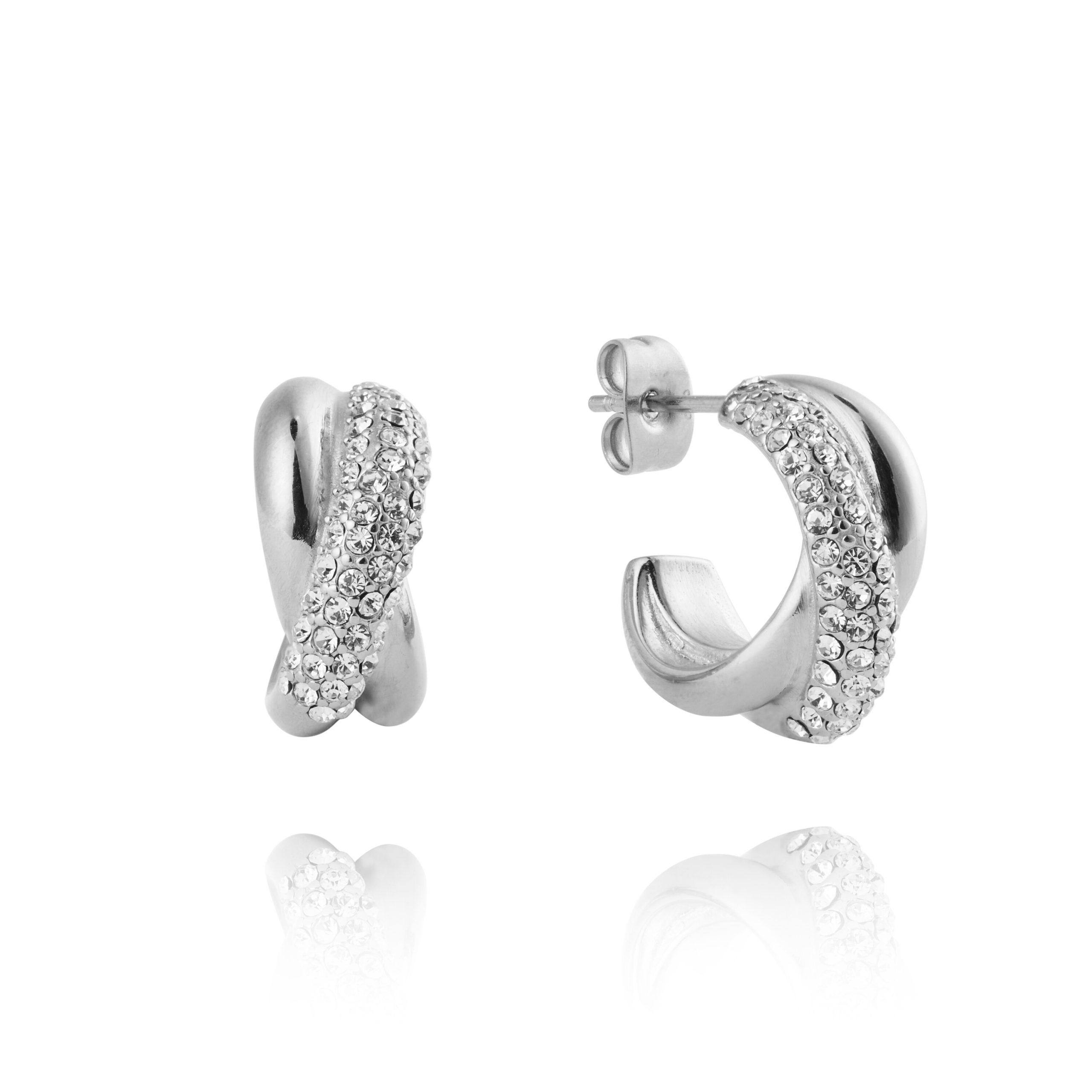 Små creoler med mjuk lyster och en ren, tidlös form. Aurora Steel Hoops i silverfärg lyfter vardagen med vita Preciosa-stenar som fångar ljuset utan att ta över.