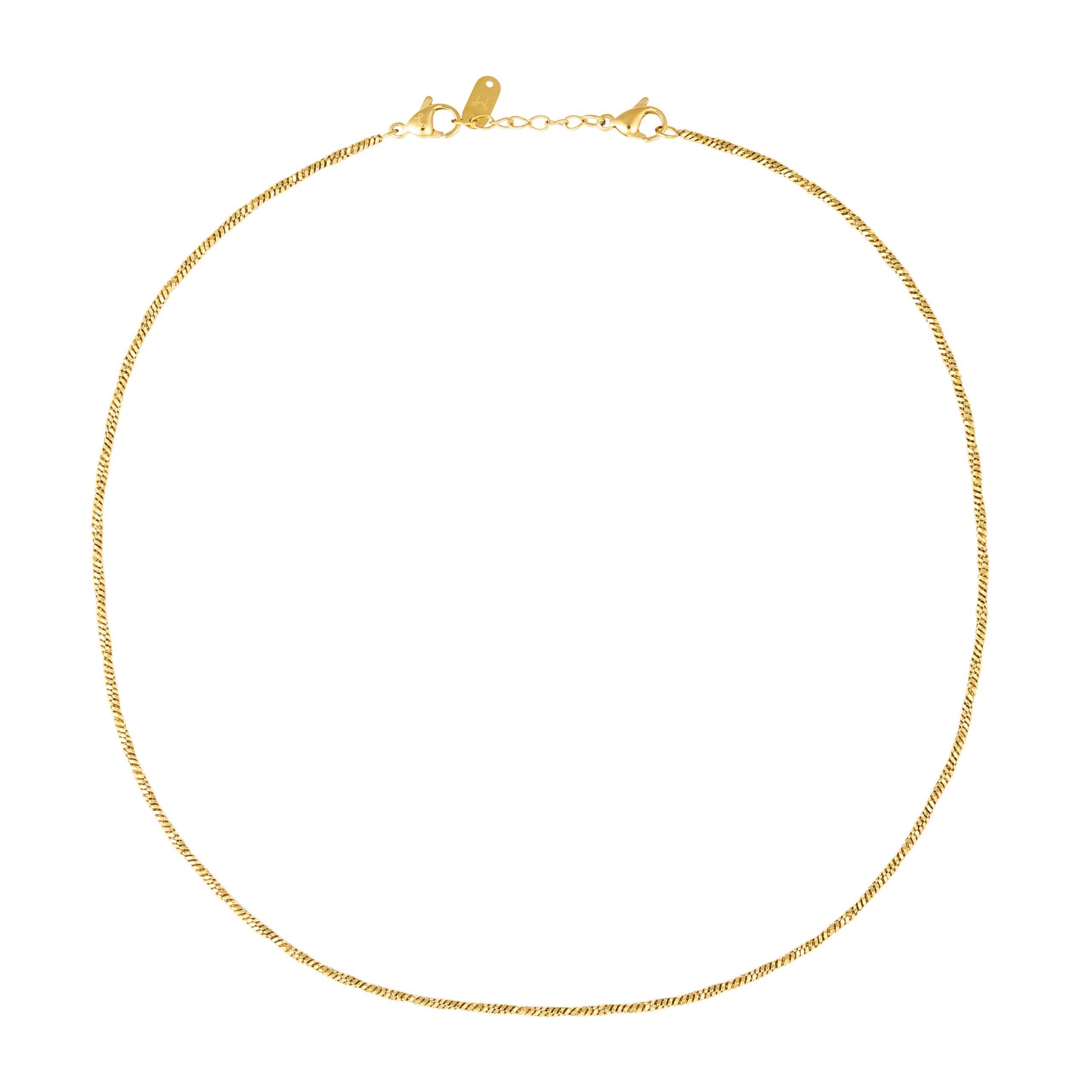En finmaskig kedja i polerat rostfritt stål med 18k guldplätering som smeker halslinjen med diskret elegans. Vattentålig design låter dig bära din stil genom regn, dusch eller strandbad utan bekymmer. Enkel, självsäker och alltid redo att lysa upp din dag.