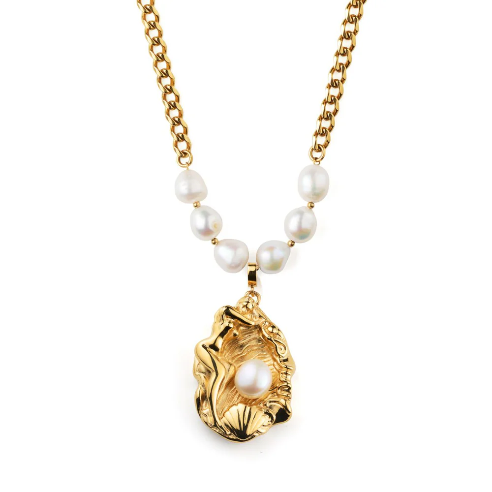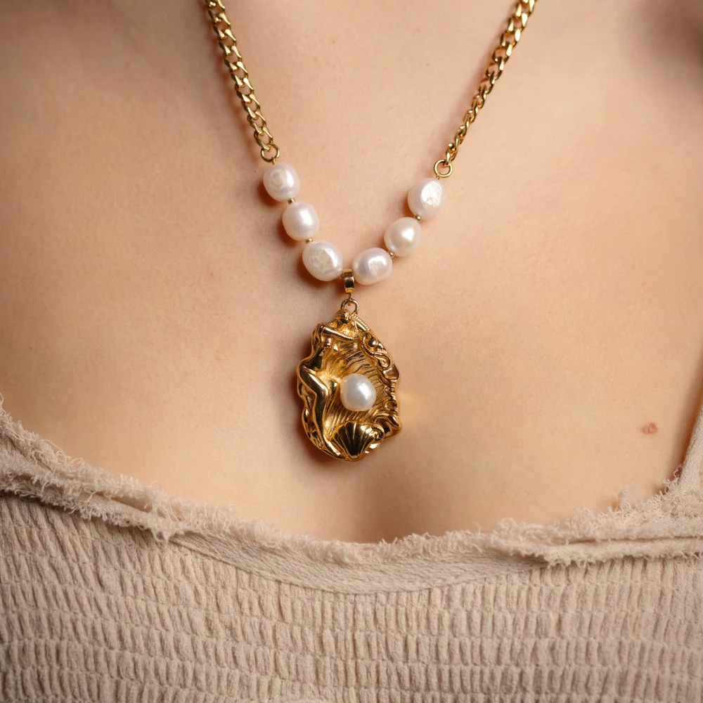Gudinnan vilar på stranden, trygg i sin egen närvaro. I centrum vilar en sötvattenpärla — mjuk, levande och fylld av ljus.