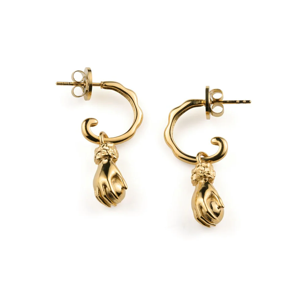 La Main, guldpläterade hoops i stål med en genomtänkt konstruktion där hänget enkelt kan tas av, så att örhängen kan bäras både som tydliga statementörhängen eller som rena hoops. Formgivna för att röra sig med bäraren och bli en del av ett personligt uttryck.