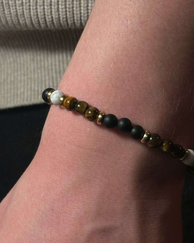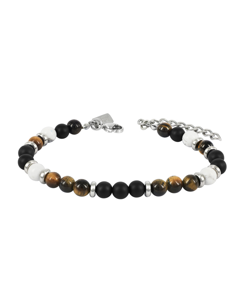 Landon, kularmband sammansatt av noggrant utvalda halvädelstenar av vit emperor i kombination med tigeröga och onyx och detaljer i matt stål.