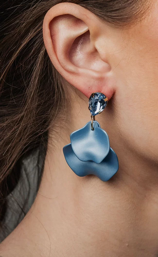 Fantastiska örhängen i form av blad i en härlig blå färg. Tillverkade av en blandning av akryl, glas, zinklegering och stål, har dessa örhängen en bländande Cubic Zirconia-studs för en touch av glans. Lätta och bekväma, de är perfekta för vardagsbruk eller speciella tillfällen.