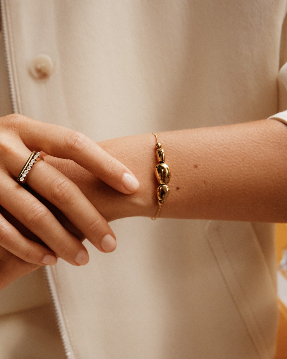 Leora guldpläterat stålarmband inspirerat av stenar på en strand som slipats lena av havets oändliga rytm, och blandar organiska former med en stilren, avskalad elegans.