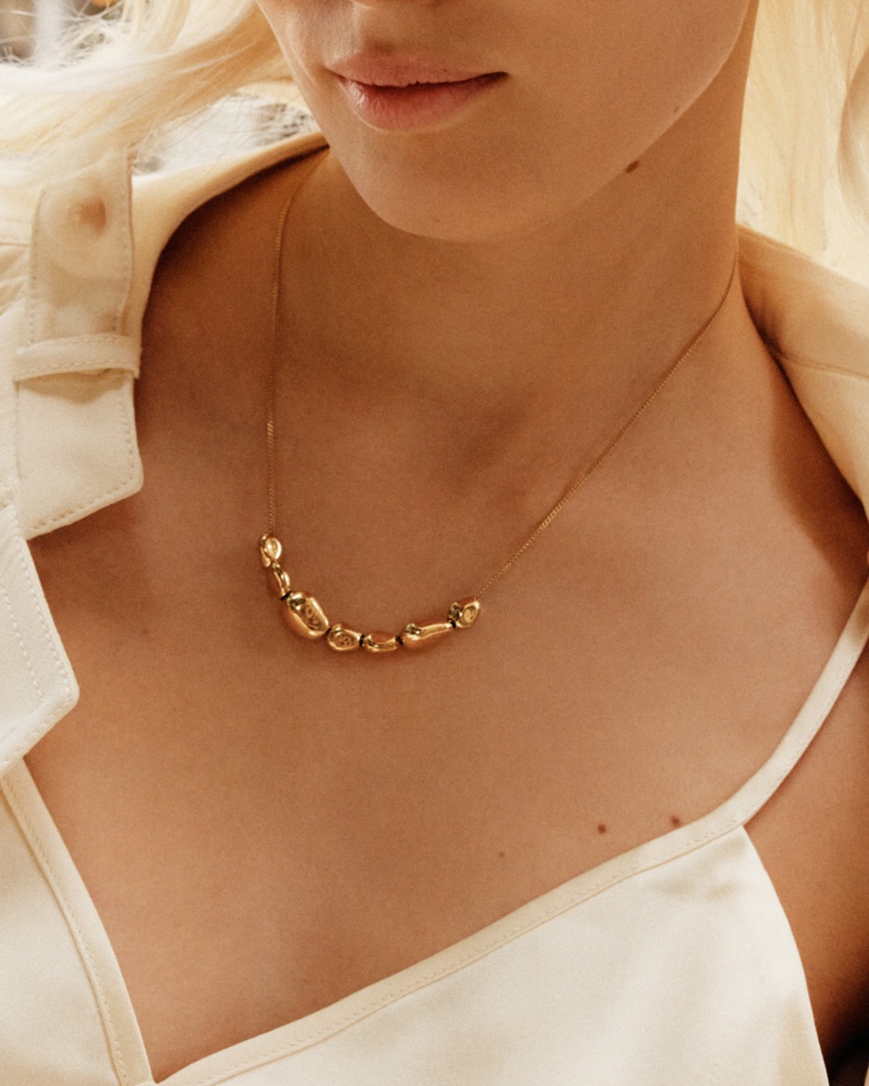 Leora guldpläterat stålhalsband inspirerat av stenar på en strand som slipats lena av havets oändliga rytm, och blandar organiska former med en stilren, avskalad elegans.