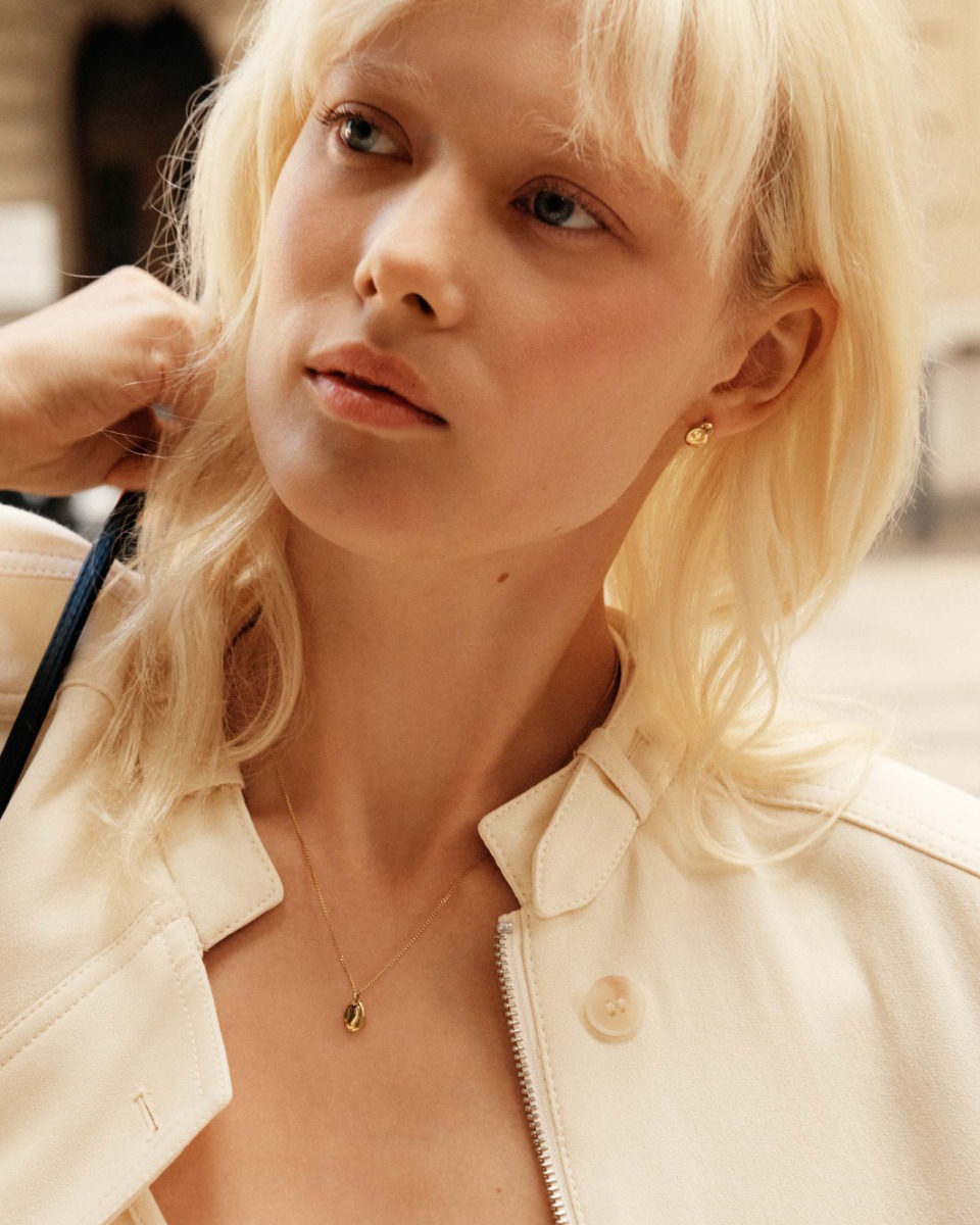 Leora guldpläterade studs i stål inspirerade av stenar på en strand som slipats lena av havets oändliga rytm, och blandar organiska former med en stilren, avskalad elegans.