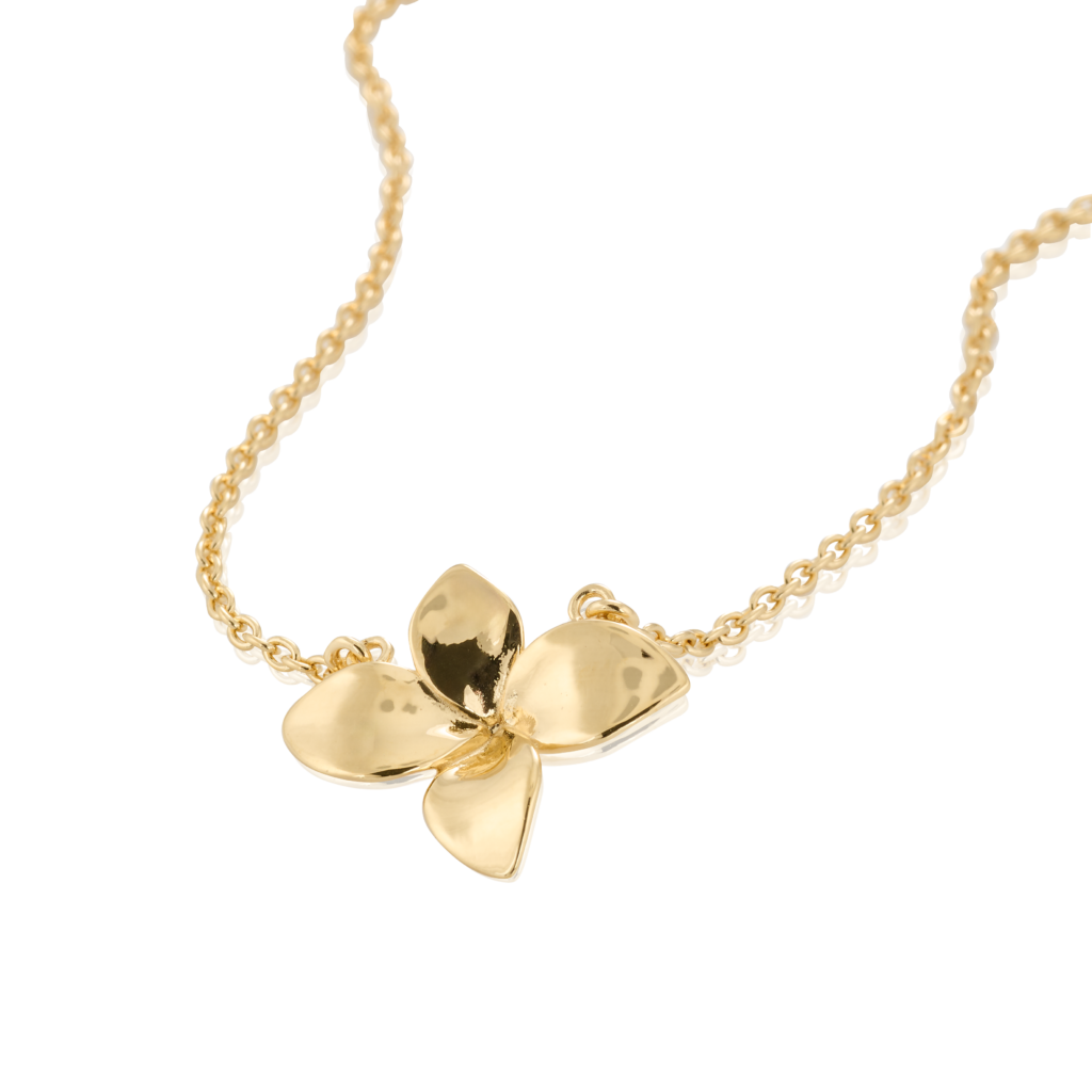 24k guldpläterat silverhalsband från Carolina Gynning med ett blankt hänge i form av en blomma med fyra blad.