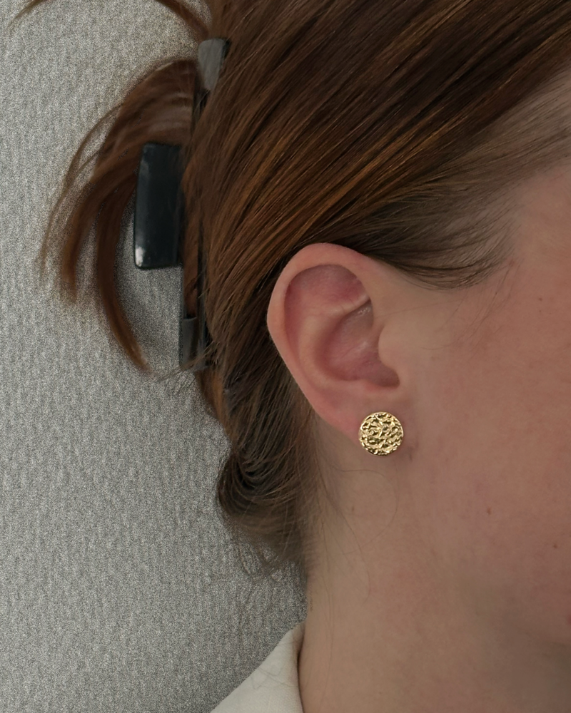 Guldpläterade stålörhängen på stift med en hamrad yta med blank finish.