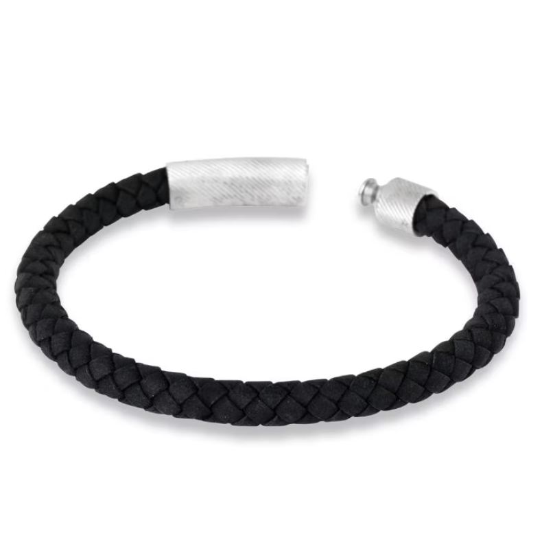 Loui, tidlöst armband i svart handflätat läder. Den klassiska designen kompletteras med ett stålspänne.