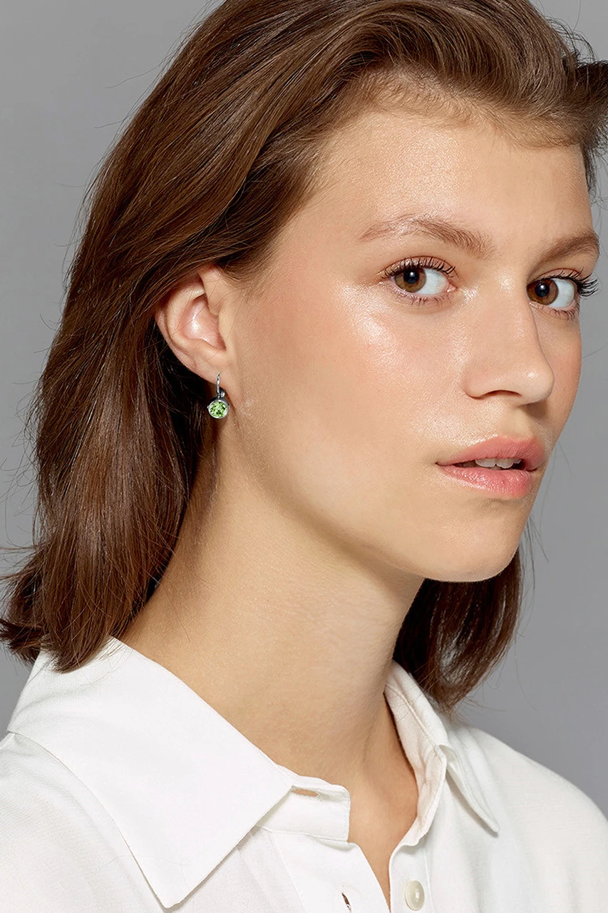 MADU- en klassiker, ett mycket populärt örhänge som kommer i nya färger varje säsong. Kristallen är ca 7 mm i diameter. Stålpläterad mässing i en silver ton med ljus varrengrön sten. Krok i kirurgiskt stål. Dansk design, handgjort. Cadmium, bly och nickelfritt.