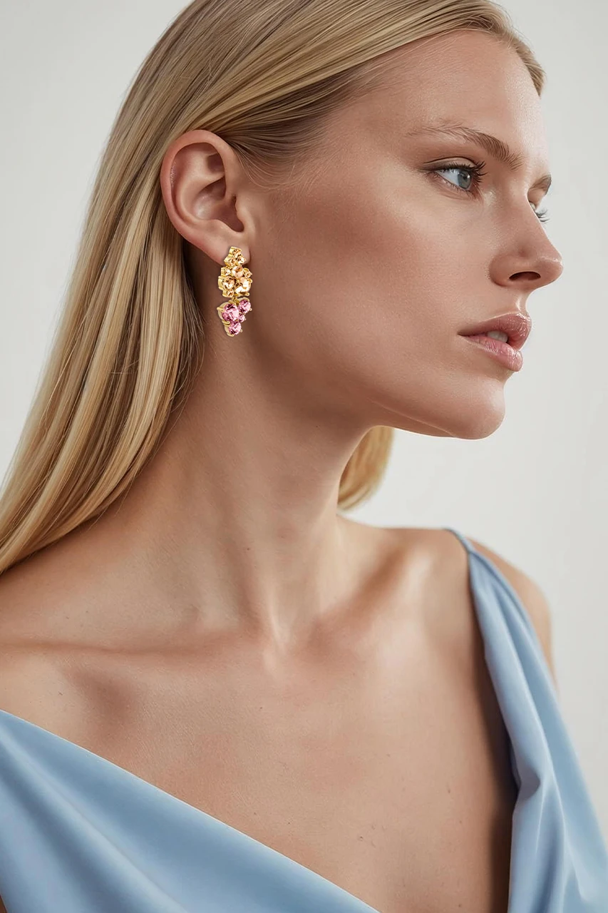 MARIGOLD – ett elegant och ovanligt stiftörhänge för fest, designad med flera mindre och större runda facetterade kristall-chatoner, satta i ett asymmetriskt mönster. Ett ovanligt men ändå ganska klassiskt design. Den nedersta delen är rörlig. Total längd 40 mm. Visas här i rosa färger och guldfinish. DANSK DESIGN – fri från kadmium, bly och nickel