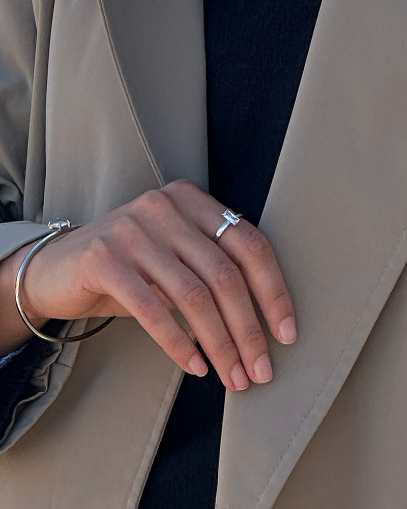 Melinda, guldpläterad baguette ring i stål med en rektangulär kristall av kubisk zirkonia.
