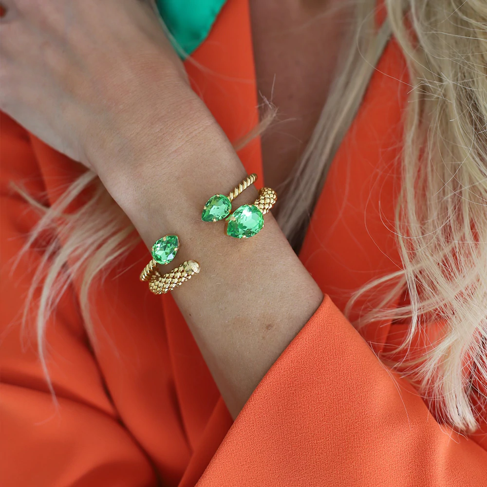 Populära Mini Drop, stelt armband i guldpläterad mässing med droppformade kristallstenar.