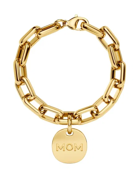 I detta kaxiga armband med en berlock i form av en rund platta med texten MOM på en överdimensionerad kedja.