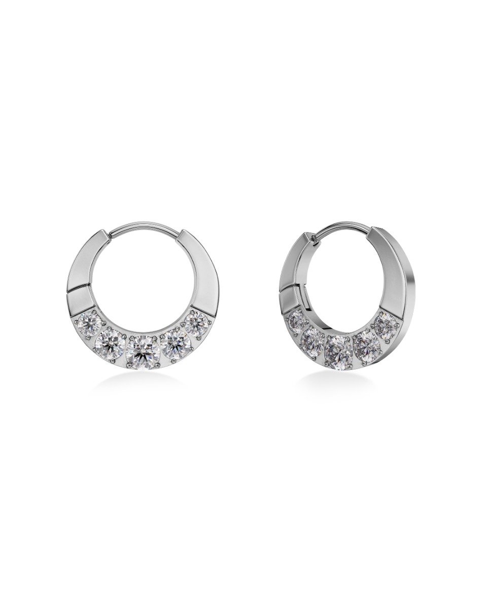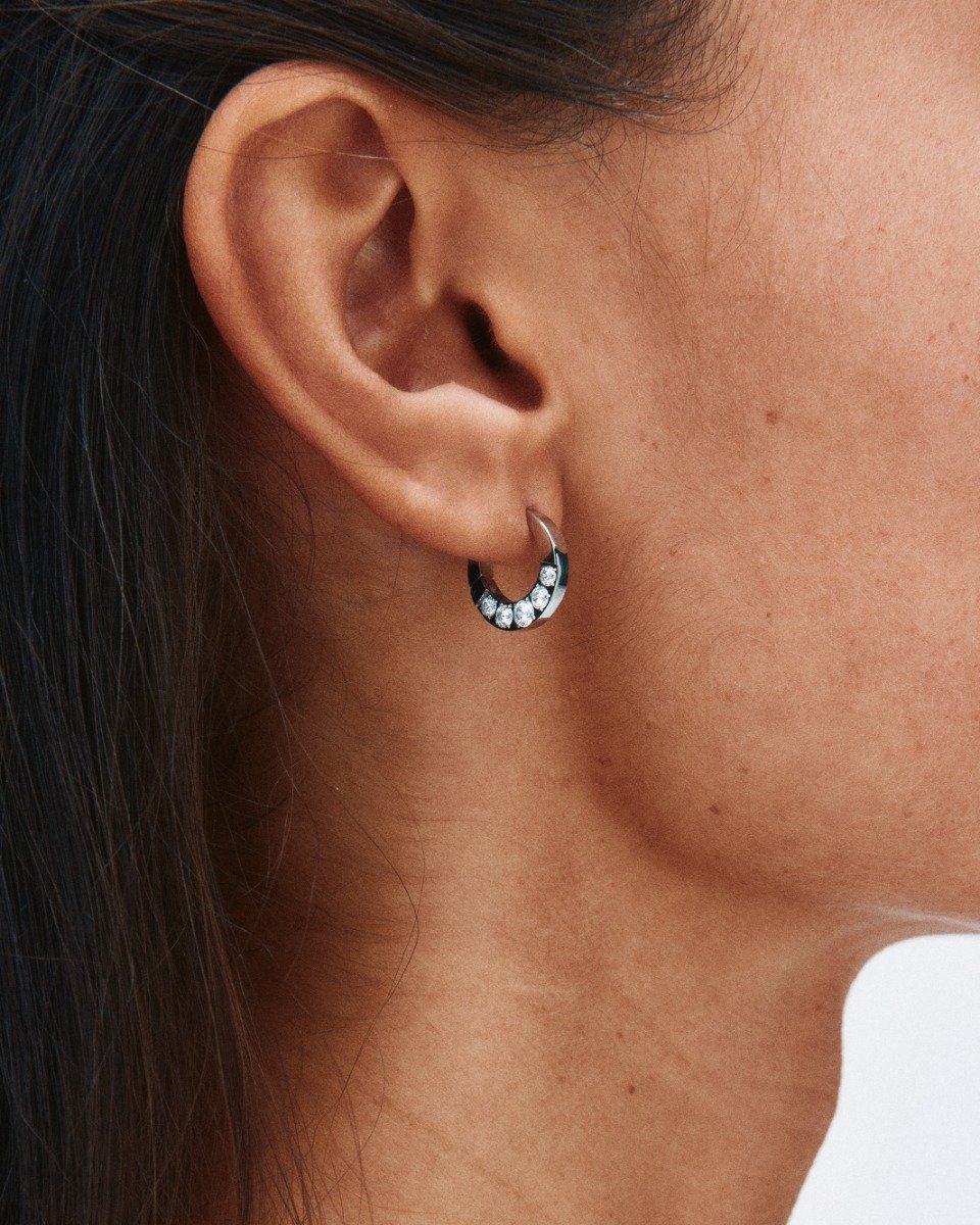 Här i små runda hoops i stål med glittrande stenar. En blivande klassiker som lyfter vilken outfit som helst.