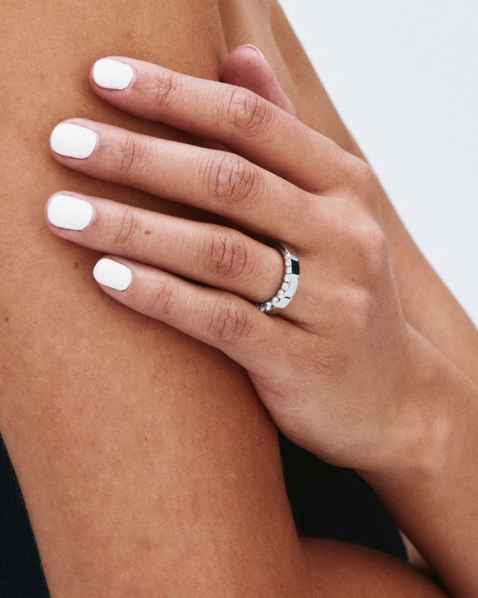 Här i en vacker stålring med glittrande stenar. En blivande klassiker som lyfter vilken outfit som helst.