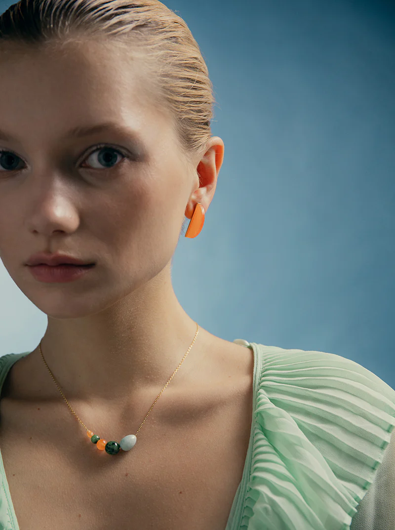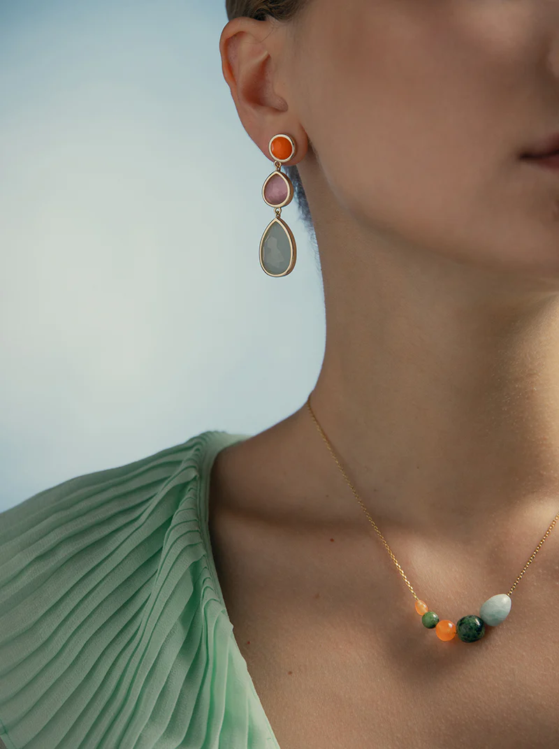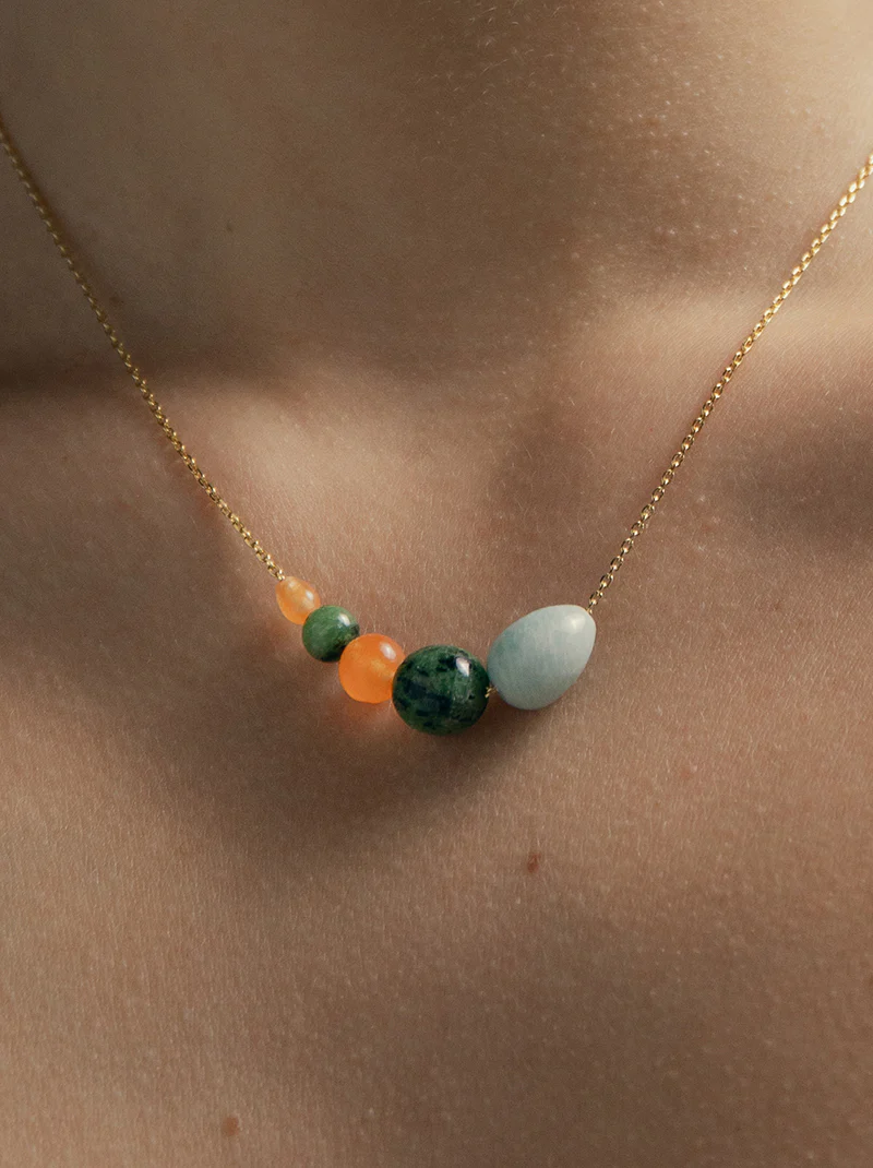 Guldpläterat silverhalsband med naturstenar i naturliga toner. Detta hänge passar perfekt till både dina mest avslappnade och dina mest eleganta looks. En elegant design som består av fyra naturstenar i rubin-zoisit-toner, en liten sten i mitten i orange jade och en tredje sten i pärslipning i amazonit.