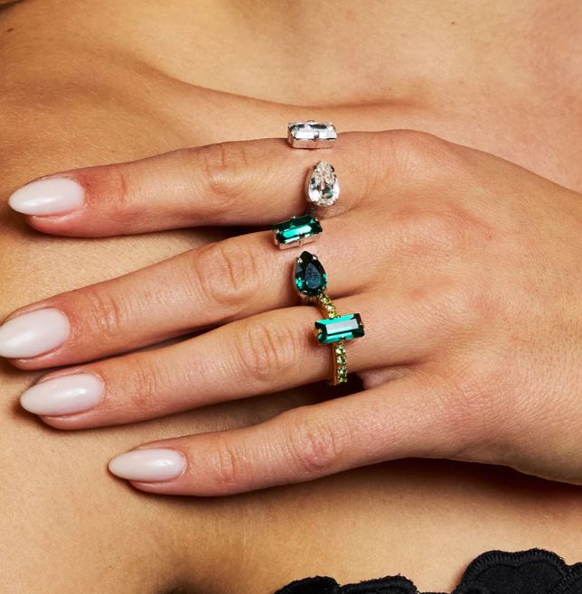 Noelle guldpläterad mässingring som präglas av två kristaller i olika former som ger ett lekfullt men stilmedvetet intryck.