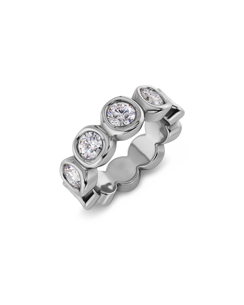Den coola och lite ovanliga ringen är mjukpolerad på insidan och har glittrande stenar runt om hela ringskenan. Fin att styla med seriens övriga delar.